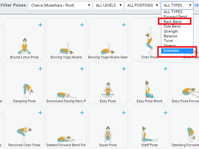 You can even select 'Backbends', 'Inversions', 'Twists', and more under 'ALL TYPES' to further filter the lists. Please see snapshot below.